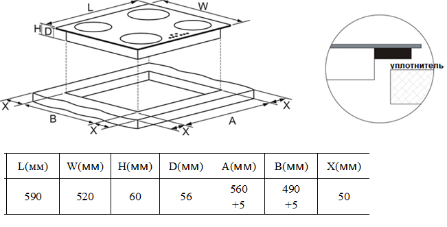 - Размер встраивания: 560×490 мм.