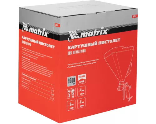 Картушный пистолет Matrix 57351 с объемом бака 9,5 л и соплами 4, 6 и 8 мм предназначен для нанесения штукатурки, вязких красок и других растворов. Высокая скорость распыления материала позволяет быстро обрабатывать участки большой площади. Инструмент используется для проведения отделочных работ.