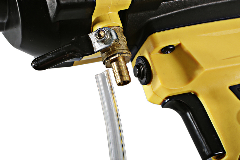 Дрель алмазного сверления Hanskonner HID2180M 1800Вт (Китай) — компактный и мощный электроинструмент с надежной конструкцией для сверления алмазными коронками отверстий в таких материалах: бетон, железобетон, искусственный и натуральный камень, кирпич. Подключив инструмент к водопроводному крану можно сократить запыленность рабочей зоны, а также износ алмазных коронок и дрели. Данная модель оснащена предохранительной муфтой, срабатывающей при заклинивании коронки, и термозащитой работающей при других видах перегруженности.