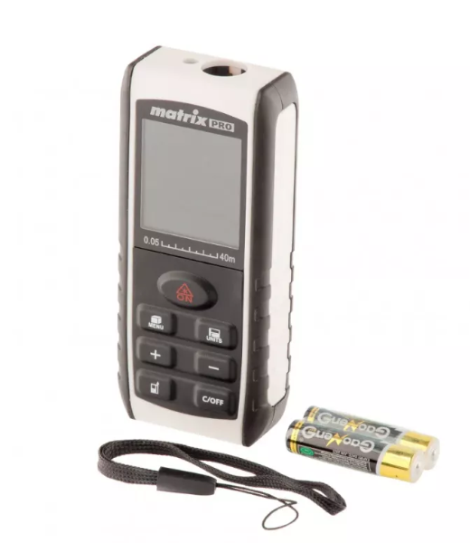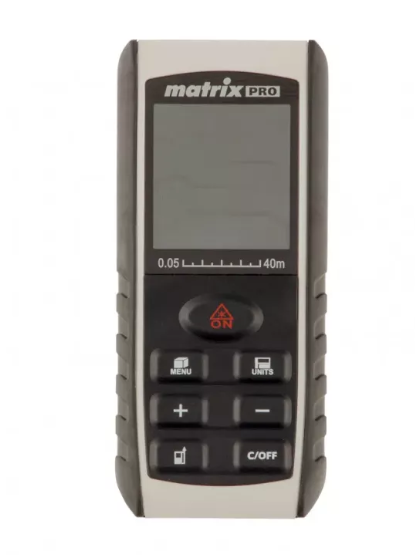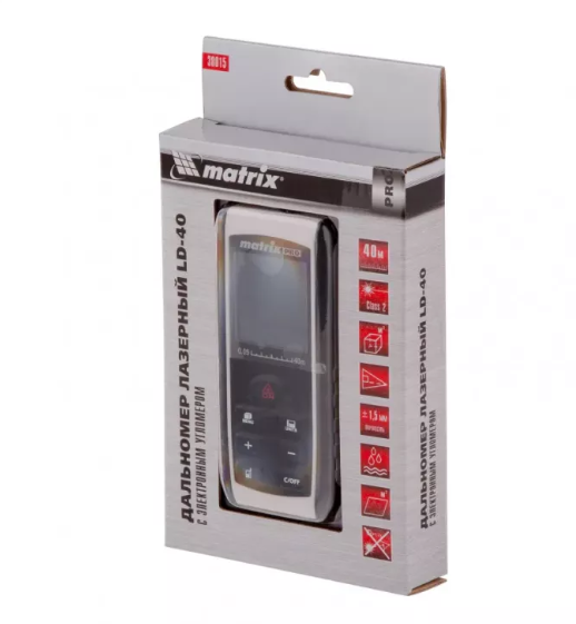 Лазерный дальномер Matrix LD-40 38015 с электронным угломером применяется для вычисления площади и объема помещения, замера углов и определения длины до 40 м. Для ускорения и облегчения работы предусмотрена возможность складывания и вычитания полученных результатов. Прибор можно использовать как в помещении, так и на улице, поэтому он подходит для проведения строительных, ремонтных, отделочных, а также дорожных и геодезических работ.