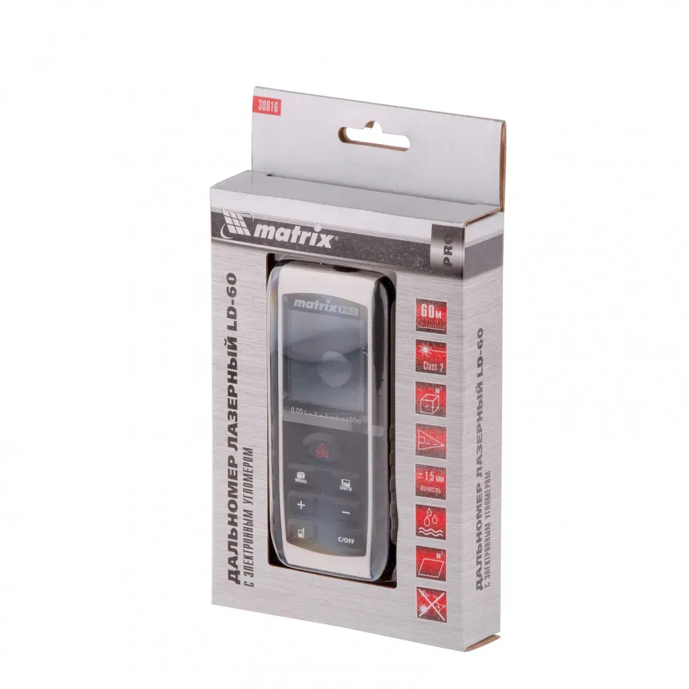 Лазерный дальномер Matrix LD-60 38016 с электронным угломером применяется для вычисления площади и объема помещения, замера углов и определения длины до 40 м. Для ускорения и облегчения работы предусмотрена возможность складывания и вычитания полученных результатов. Прибор можно использовать как в помещении, так и на улице, поэтому он подходит для проведения строительных, ремонтных, отделочных, а также дорожных и геодезических работ.