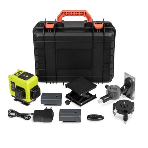 3D лазерный нивелир DLT EK-118G строит три плоскости по 360° (12 линий), может строить наклонные проекции, имеет рабочий диапазон до 30 метров (в зависимости от освещенности) и погрешности в диапазоне ±2мм/10м (точнее не бывает «в природе» среди призменных уровней, только линейные бывают точнее).
