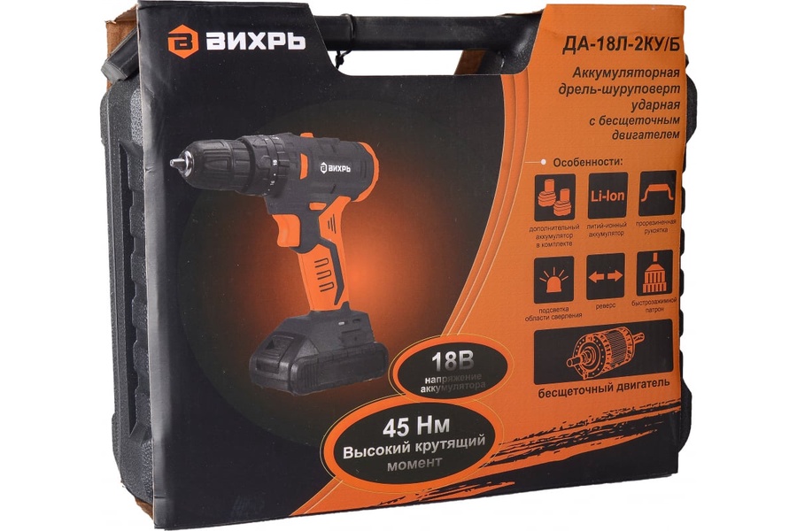 Дрель-шуруповерт ВИХРЬ ДА-18Л-2КУ/Б имеет функцию реверса. Это позволяет осуществлять обратное вращение для выкручивания крепежей. Светодиодная подсветка рабочей зоны дает возможность работать в условиях слабого освещения. Система защиты от перегрузок предотвращает поломку в случае заклинивания сверла или биты. Эргономичная форма и прорезиненная рукоятка обеспечивают комфортный рабочий процесс. Удобный кейс из плотного пластика позволяет компактно и безопасно хранить и транспортировать инструмент.