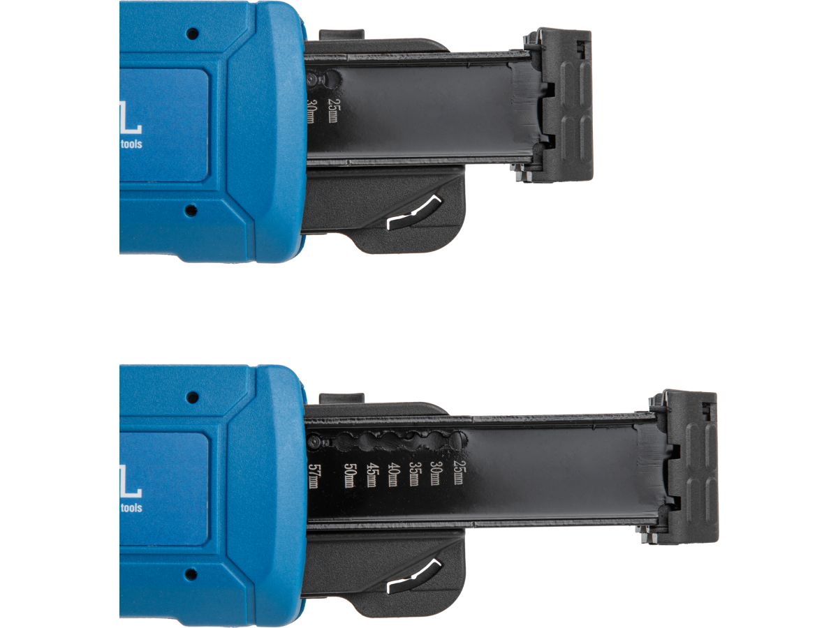 Аккумулятор ленточный шуруповерт BULL CAS 1844 бесщеточный 18В 4400 об/мин 57 мм (Китай) обладает двумя съемными насадками: для штучного и серийного закручивания шурупов. Насадка для серийного закручивания обладает регулировкой выноса носовой части, что позволяет использовать оператору саморезы различной длины (от 25 до 57 мм). Шуруповерт имеет селектор регулировки глубины, а также функцию реверса для откручивания. Кнопка блокировки позволяет беспрерывно работать при выполнении длительных задач.