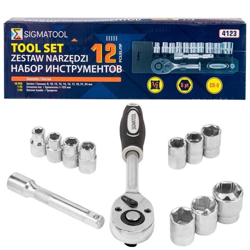 Набор головок с трещоткой и удлинителем в пластиковом держателе 12 предметов 1/2''(6гр) 8,10,12-15,17,19,21,24мм (Китай) - данный набор инструментов на 12 предметов идеально подходит для использования в автомобильных и механических работах. Все инструменты изготовлены из высококачественной хромванадиевой стали, обладают прочностью и долговечностью, что гарантирует их долгий срок службы.Трещотка снабжена эргономичной прорезиненной рукояткой, что делает работу комфортной и удобной даже при продолжительном использовании. Комплектация: головки (8, 10, 12, 13, 14, 15, 17, 19, 21, 24 мм), трещотка 255мм 24зуб., удлинитель 125мм, пластиковый держатель.