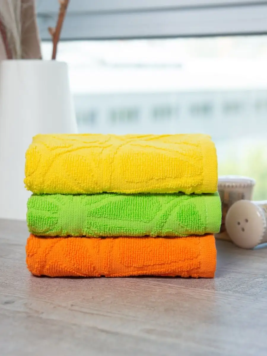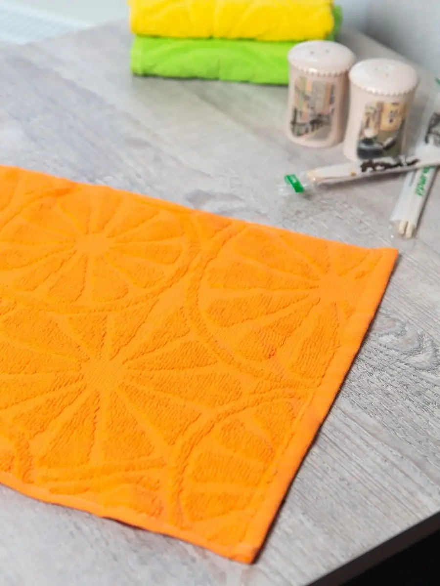 Махровое кухонное полотенце украшено жаккардовым узором в виде долек апельсина — ярким, жизнерадостным и трендовым. Цветовая гамма — зелёный, оранжевый и жёлтый — наполняет пространство светом, теплом и летним настроением.