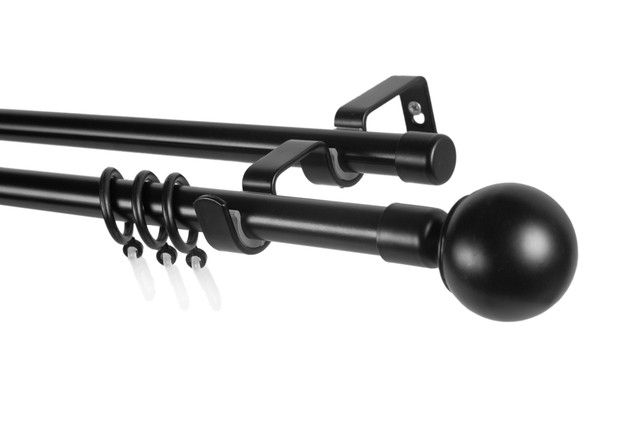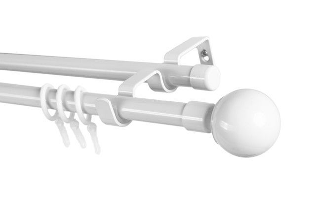 Карниз Лайт «Сфера» 19мм двухрядный доступен в цвете "Белый глянец", "Черный матовый". Длина карниза без навесных элементов может варьироваться от 160 до 300 см. Комплектуется двумя штангами, двумя или тремя кронштейнами (в зависимости от длины), парой наконечников, крепежом для кронштейна, пластиковыми облегченными кольцами с крючком.