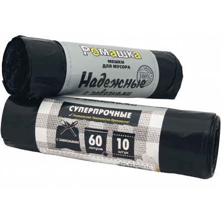 Мешки для мусора с завязками 60 л 10 шт черные НАДЕЖНЫЕ РОМАШКА (Россия) - это очень прочные пакеты из материала: полиэтилен среднего давления, которые подойдут даже самому требовательному покупателю.