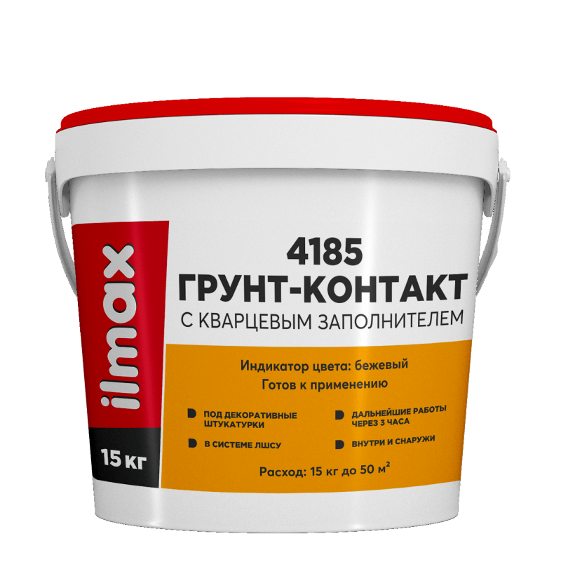 Грунтовка-контакт ilmax 4185 разработана для создания шероховатой поверхности перед нанесением защитно-отделочных штукатурок, цементных, известковых, гипсовых штукатурок и шпатлевок, что значительно упрощает их нанесение. Рекомендуется для покрытия на основания из бетона, гипсокартона, стекломагнезитовых листов, цементных, известковых и гипсовых штукатурок, прочных малярных покрытий. Расход — 0,2-0,5 л/м2. Грунтовка готова к применению и не требует разбавления. Перед работай рекомендуется тщательно размешать. Основание должно быть сухим, очищенным от пыли, извести, масел, жира, остатков старой краски и других загрязнений, способных понизить адгезию. Время высыхания — 2-3 часа. Температура окружающей среды и основания должна быть в диапазоне +5+25 С.