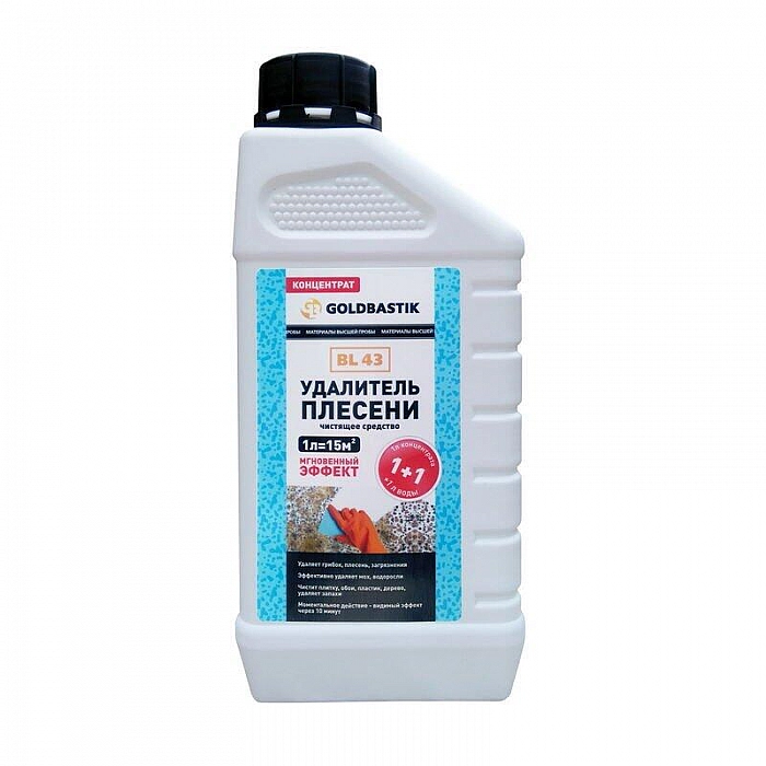 Удалитель плесени GOLDBASTIK BL 43 концентрат 1:1 1л (Беларусь) - эфективное средство для удаления плесени, грибка, мха, водорослей, слизистых, мыльных и других глубоко въевшихся загрязнений с керамической плитки и стыков, обоев, пластика, дерева, бетона, гипсокартона, окрашенных поверхностей, искусственного и натурального камня, цоколя, бордюров, памятников и т. п. Обладает дезинфицирующим эффектом.