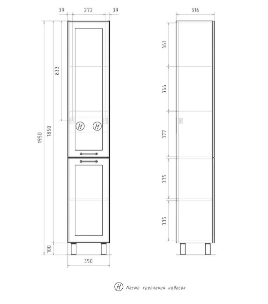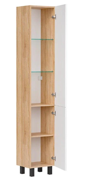 Напольный пенал с двумя стеклянными полками в верхней секции и одной полкой из ЛДСП в нижней секции. Петли с доводчиками.
