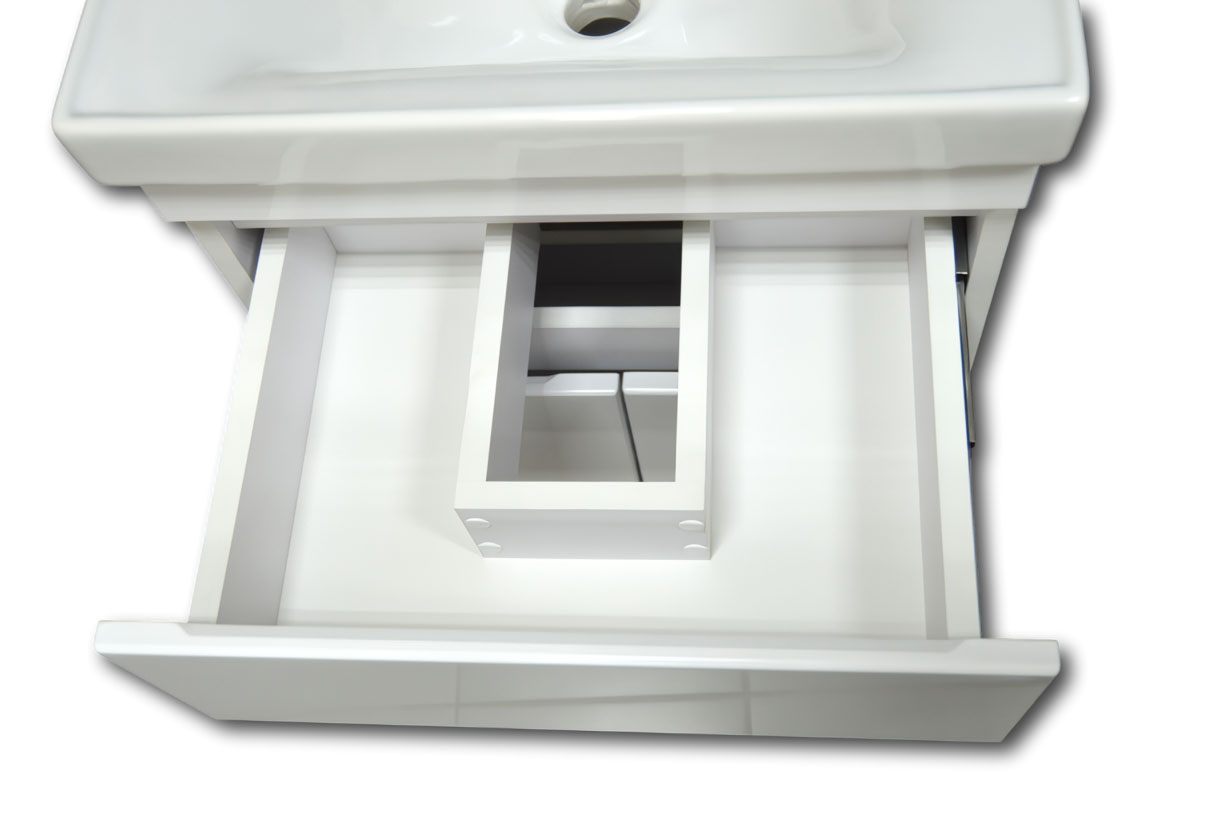 Фасад изготовлен из МДФ 16мм, облицованный пленкой ПВХ белого цвета (высокий глянец). Корпус тумбы изготовлен из ЛДСП 16мм белого цвета (Аляска) идеально сочетающийся с цветом фасада, торцы корпуса облицованы кромкой ПВХ.