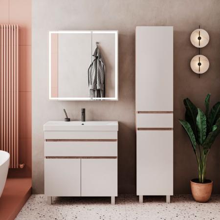 Напольная тумба с двумя распашными дверцами и одним выдвижным ящиком. За распашными дверцами полка из ЛДСП. Фурнитура оснащена системой плавного закрывания. Фасады тумбы изготовлены из МДФ, облицованы глянцевой пленкой ПВХ. Ящик и дверки открываются при помощи интегрированной ручки. Тумба устанавливается на две регулируемые опоры и фиксируется к стене при помощи креплений.