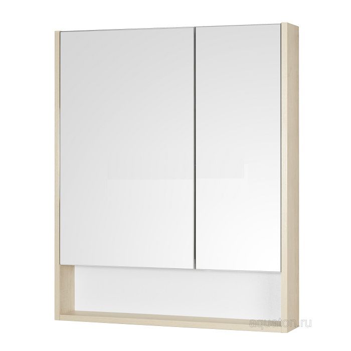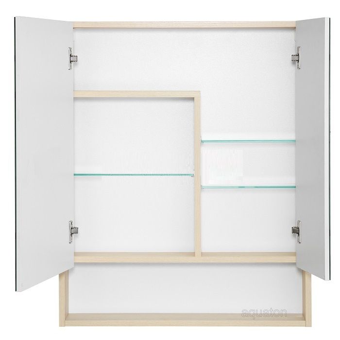 Зеркальный шкаф Сканди 70 белый/дуб верона Акватон (Россия) - подвесной зеркальный шкаф с открытой нишей. За распашными дверцами, оснащенными механизмом плавного закрывания, находятся асимметричные полки, позволящие расположить косметические средства различной высоты.