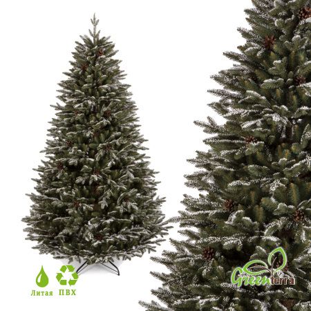 - Отличительная особенность этой модели: ёлочка слегка припорошена снежными хлопья, на некоторых литых веточка есть шишки.