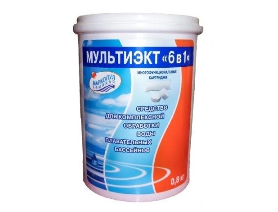 Средство для очистки воды Мультиэкт 6в1 картриджи 800г (Россия) - состав картриджа специально разработан таким образом, чтобы обеспечить полный уход за водой бассейна: поддержание концентрации остаточного свободного хлора (за счет комбинации быстро- и медленнорастворимых хлорсодержащих веществ); стабилизация хлора (предотвращение быстрого разложения активного хлора под воздействием УФ- излучения, яркого солнечного света и высоких температур); поддержание прозрачности и чистоты воды (улучшение фильтрации); предотвращение появления водорослей в бассейне; осветление воды за счет окисления загрязняющей воду органики.