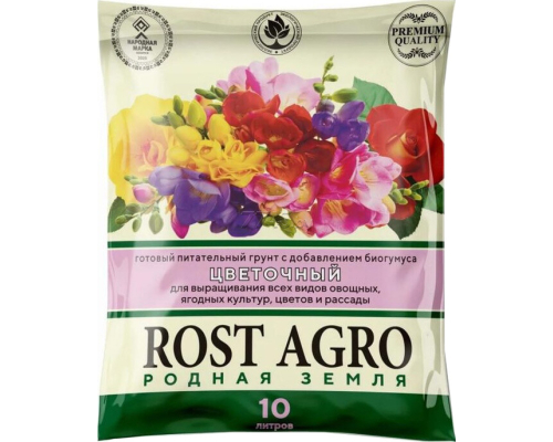 Грунт плодородный ROST AGRO Цветочный 10 л для выращивания всех видов цветов, рассады, овощных и ягодных культур. Состав: торф, биогумус (компост), песок, минеральные раскисляющие добавки, азотные, комплексные и микрогранулированные удобрения с микроэлементами. Микроэлементы, мг/кг: азот - 500, фосфор - 450, калий - 380.