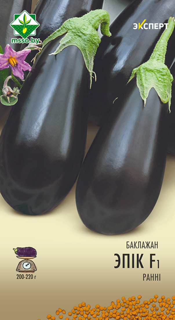 Баклажан Эпик F1 Эксперт семена (Беларусь) - ранний гибрид голландской селекции. Растение полураскидистое, высотой 70-80 см. Плоды цилиндрические, слегка утолщенные к вершине, глянцевые, гладкие, в технической спелости фиолетово-черные, массой 200-220 граммов. Мякоть белая, без горечи. Вкусовые и технологические качества отличные. Характеризуется высокой урожайностью, хорошей завязываемостью плодов. Для возделывания в необогреваемых теплицах.