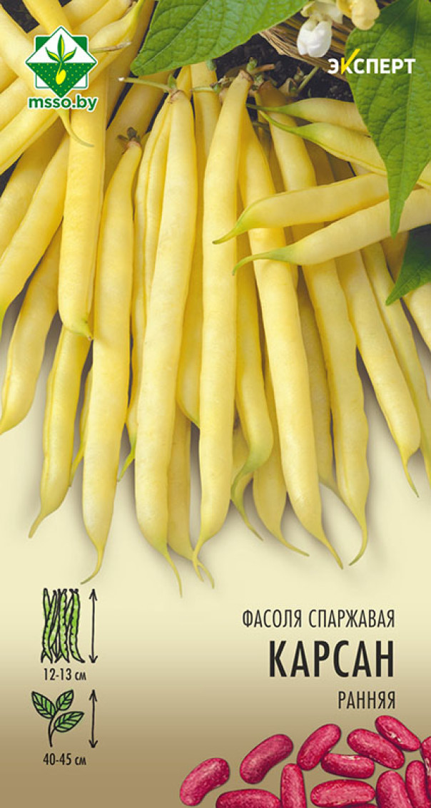 Фасоль Карсон спаржевая 8г Эксперт (Беларусь) - ранний сорт голландской селекции. Период от всходов до технической спелости 53-58 дней. Растение компактное, кустового типа, высотой 40-45 см. Стручки желтые, глянцевые, длиной 12-13 см, почти округлые в поперечном разрезе, мясистые, без жесткого пергаментного слоя и волокна. Дегустационная оценка 5 баллов. В пищу используют молодые стручки и вызревшие семена после термической обработки.