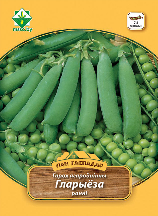 Горох Глориоза овощной 30г Пан Гаспадар (Германия) - ранний сорт германской селекции. Период от всходов до технической спелости 55-60 дней. Длина стебля 75-85 см. Стручки в технической спелости зелёные, длиной 7-8 см, имеют пергаментный слой. В стручке 7-8 семян.Вкусовые, диетические и технологические качества хорошие. В пищу употребляют зелёные семена в свежем или консервированном виде без створок. Неприхотлив в выращивании. Пригоден для замораживания.