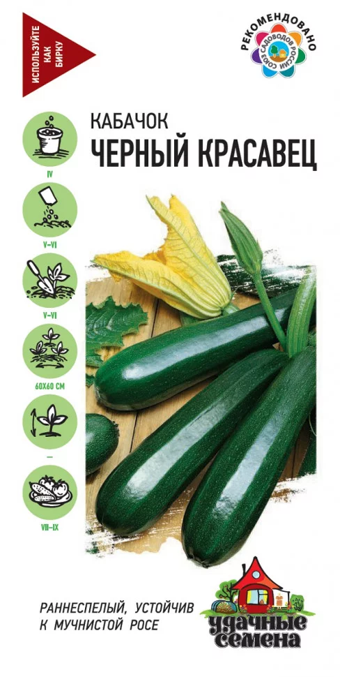 Кабачок Черный красавец 2г Удачные семена (Россия) - раннеспелый (40–45 дней от всходов до созревания) сорт. Растение кустовое. Плод цилиндрический, темно-зеленый, без пятнистости, ребристый, сильноглянцевый, массой 0,8–1,7 кг. Кора средней толщины. Мякоть светло-бежевая, плотная, сочная. Сорт ценится за нежный вкус плодов и высокую устойчивость к мучнистой росе. Молодые завязи (10–15 см) используют в свежем виде в салатах. Зрелые плоды хранятся до 10 месяцев. Урожайность 7,0–9,7 кг/м2.