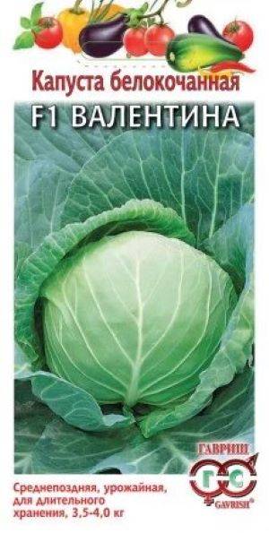 Капуста белокочанная Валентина F1 для хранения (Россия) - позднеспелый (140-180 дней от всходов до технической спелости) гибрид. Розетка листьев приподнятая. Лист среднего размера, серо-зеленый с сильным восковым налетом, по краю слабоволнистый. Кочан среднего размера, обратнояйцевидной формы, очень плотный, на разрезе белый. Масса кочана 3,5-4,0 кг. Гибрид ценится за высокую урожайность, отличные товарные и вкусовые качества. Урожайность 6,8-8,0 кг/м2.