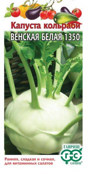 Капуста кольраби Венская белая 1350 0,5г (Россия) - скороспелый сорт (от всходов до хозяйственной годности 65-80 дней). Стеблеплод крупный, округлый, светло-зеленого цвета, массой 2,5-3 кг. Мякоть сочная, нежная, с высоким содержанием витамина С, имеет высокие вкусовые качества. Убирают при достижении корнеплодом диаметра 8-10 см. За сезон можно получить до 3-4 урожаев, высаживая рассаду с интервалом через месяц. Ценность сорта: дружная отдача урожая, высокая жаро- и засухоустойчивость. Рекомендуется для употребления в свежем, тушеном и маринованном виде, в супах.