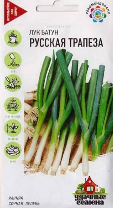 Лук батун Русская трапеза на зелень 0,5г (Россия) - скороспелый урожайный сорт для получения ранней зелени. Формирует белую довольно крупную луковицу и зеленую розетку листьев. Листья среднего размера, сочные, очень нежные , со слабоострым вкусом . Сорт отличается низкой продуктивностью. Используют в свежем виде в салатах, супах, для украшения закусок , добаяляют овощные, мясные и рыбные блюда, разнообразные соусы, маринады. Его можно заморозить и использовать в зимний период как поливитаминную зелень. Посев семян непосредственно в открытый грунт производят в конце апреля - начале мая, на внесение 1,0-1,5 см по схеме 4-5 х 10-15 см. Сбор урожая начнут в конце июня — начале июля, когда листья достигнут высоты 20-30 см.
