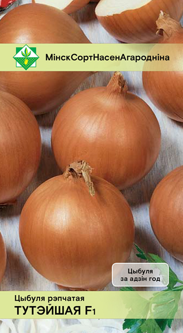 Лук Тутэйшы F1 0.5г (Беларусь) - среднеранний урожайный гибрид белорусской селекции. Период от всходов до уборки 100-105 дней. Луковицы одногнездные, плотные, округло-плоской формы, золотисто-желтого цвета, массой 120-130 граммов. Внутренние сочные чешуи белые. Вкус острый. Универсального назначения. Лежкость хорошая. Устойчив к стрелкованию и болезням. Рекомендован для выращивания лука репчатого в однолетней культуре из семян.