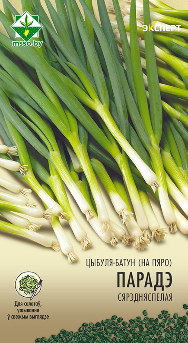Лук-батун на перо Параде Эксперт (Россия) - среднеспелый урожайный сорт голландской селекции. Листья зеленые, прямостоячие, высотой до 50 см, сочные, долго не грубеют, полуострого вкуса. Луковицу практически не формирует. Выращивают прямым посевом семян в открытый грунт. Для непрерывного получения зелени посевы повторяют с интервалом в 20 дней. Если срезать перья, не вырывая корневище, появятся новые побеги.
