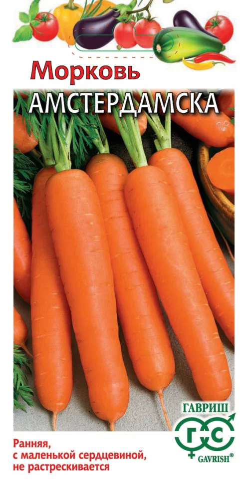 Морковь Амстердамска 2г (Россия) - раннеспелый (80 дней от всходов до технической спелости) сорт. Посев в грунт производится в конце апреля – начале мая на глубину 1 см, расстояние между рядками 15 см. Подросшие всходы прореживают, оставляя между растениями по 5-7 см. Корнеплод цилиндричесий, выравненый. Длина 14-16 см. Поверхность оранжевая. Мякоть отличного вкуса. Универсального назначения, используется для сбора пучками, для хранения, прекрасно подходит для домашней кулинарии. Урожайность 3-5 кг/м2.