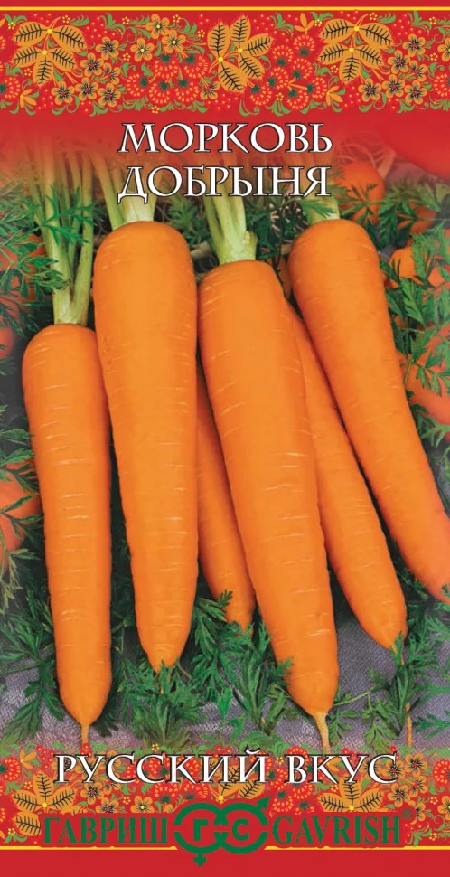 Морковь Добрыня 2г серия Русский вкус (Россия) - среднеспелый (85-105 дней от всходов до технической спелости) сорт. Рекомендуется для соков, овощного пюре, диетических свежих салатов, для приготовления первых и вторых блюд. Посев в грунт производится в конце апреля – начале мая на глубину 1 см, расстояние между рядками 20 см. Розетка листьев полураскидистая. Корнеплод конический со слегка заостренным кончиком, до 18-20 см, со слегка выпуклой головкой. Сердцевина и кора оранжевые. Масса 110-200 г. Отличается повышенным содержанием каротина и сахара, выравненностью корнеплодов. Пригодна для длительного хранения. Урожайность 2,2-4,3 кг/м2.