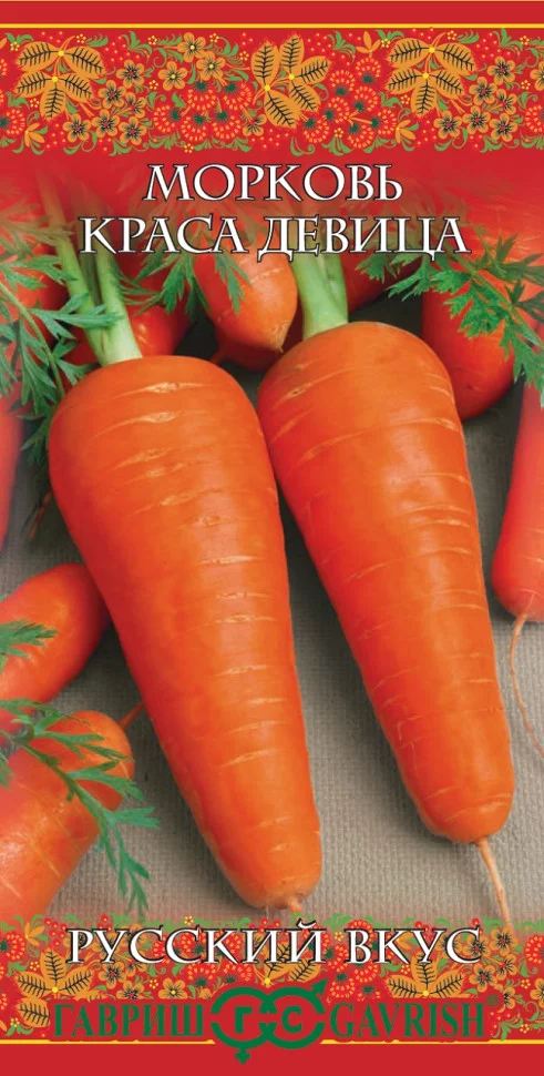Морковь Краса девица 2г серия Русский вкус (Россия) - среднеранний (105-115 дней от всходов до технической спелости) сорт с прекрасными вкусовыми качествами. Отлично подходит для приготовления поливитаминных соков, свежих салатов, овощных гарниров, после кулинарной переработки полезные свойства не теряет. Корнеплоды ярко-оранжевые, конические, тупоконечные, длиной 14-16 см, диаметром 4-5 см, массой 90-140 г; очень сладкие и сочные. Сорт характеризуется устойчивостью к цветушности. Посев семян в грунт производится в конце апреля–начале мая на глубину 1 см, расстояние между рядками 20 см. Подросшие всходы прореживают, оставляя между растениями по 5-7 см. Урожайность 2,3-4,3 кг/кв.м.
