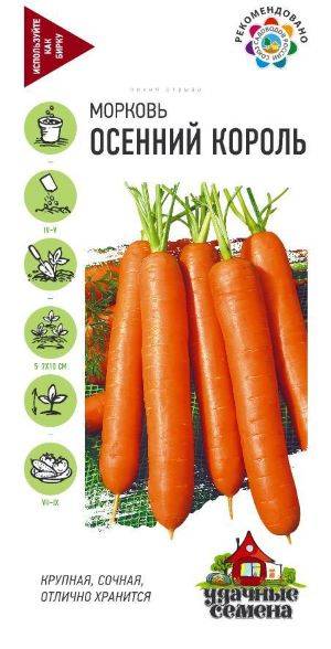 Морковь Осенний король 2г (Россия) - среднепоздний (период от всходов до уборки урожая 110-115 дней) популярный высокоурожайный сорт. Розетка листьев полураскидистая. Корнеплоды цилиндрической формы (сортотип Нантская), длиной 20-23 см, массой 100-250 г. Мякоть насыщенного оранжевого цвета содержит повышенное количество натурального провитамина А (каротина) и полезных сахаров. Хорошо хранится, сохраняет питательную ценность вплоть до нового урожая и помогает восполнить недостаток витаминов в течение всей зимы. Урожайность 2,5-5,0 кг/м2. Рекомендован для употребления в свежем виде, консервирования и зимнего хранения. Посев семян в грунт производится в конце апреля – начале мая на глубину 1 см, расстояние между рядками 15 см. Подросшие всходы прореживают, оставляя между растениями по 5-7 см.