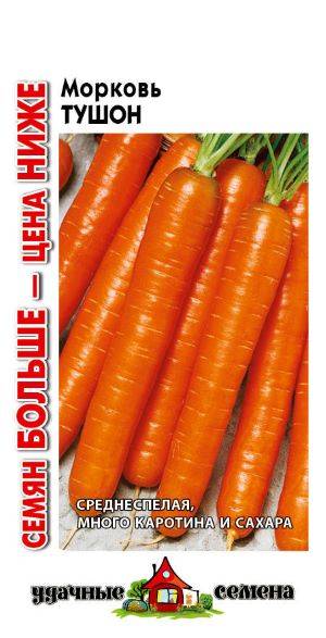 Морковь Тушон 3г Удачные семена Семян больше (Россия) - среднеспелый (период от всходов до уборки урожая 80–90 дней) популярный сорт с выравненными товарными корнеплодами. Розетка листьев полураскидистая. Корнеплоды цилиндрические с тупым кончиком (сортотип Нантская), длиной 18–20 см, массой 100–170 г. Поверхность гладкая с мелкими глазками. Мякоть вкусная, сочная, с высоким содержанием каротина. Выращивают прямым посевом в открытый грунт. Рекомендуется для получения ранней пучковой продукции. Урожайность 6,0–6,5 кг/м2