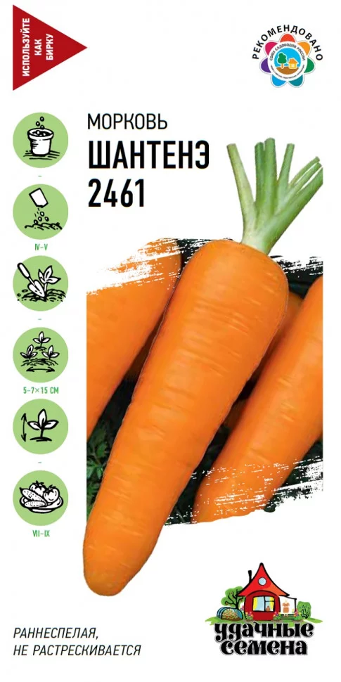 Морковь Шантенэ 2461 2г Удачные семена (Россия) - среднеранний (105-115 дней от всходов до технической спелости) сорт. Розетка листьев полустоячая. Окраска поверхности, сердцевины и мякоти корнеплода – оранжевая. Корнеплод конический, тупоконечный, длиной до 15 см, диаметром 5-6 см, массой 80-250г, отличного вкуса. Корнеплод полностью погружен в почву. Сорт характеризуется устойчивостью к цветушности. Рекомендован для потребления в свежем виде и переработки. Урожайность 2,0-4,0 кг/м2.