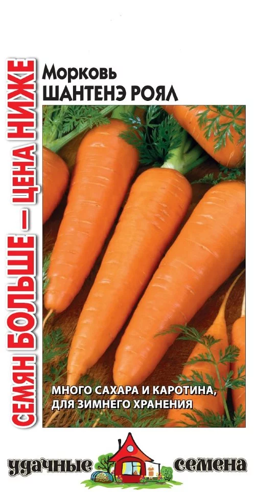 Морковь Шантенэ Роял 4г Удачные семена Семян больше (Россия) - среднеспелый (86-110 дней от всходов до технической спелости) сорт. Выращивают посевом в открытый грунт на глубину 1 см. Лист длинный, зеленый, с мелкой рассеченностью. Корнеплод короткий, конический со слегка заостренным кончиком (сортотип Шантенэ), головка слегка выпуклая до ровной. Сердцевина и кора оранжевые. Масса 110-200 г Сорт характеризуется повышенным содержанием каротина и сахара, выравненностью корнеплодов. Рекомендуется для использования в свежем виде и длительного зимнего хранения. Урожайность 2,0-4,1 кг/м2.