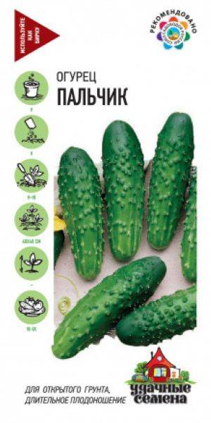 Огурец Огурец Пальчик 0,5г Удачные семена (Россия) - раннеспелый (44-46 дней от всходов до плодоношения), пчелоопыляемый, универсальный сорт. Рекомендуется для выращивания в открытом грунте. Посев на рассаду в начале мая. Высадка в грунт в конце мая – начале июня в фазе 2-3-х настоящих листьев. Посев непосредственно в грунт – в конце мая. Схема посадки 40х40 см. Растение индетерминантное, сильноплетистое, средневетвистое, преимущественно женского типа цветения, с пучковым заложением завязей. Лист крупный, темно-зеленый. Зеленец удлиненно-цилиндрической формы, темно-зеленый, с полосками средней длины и слабой пятнистостью, крупнобугорчатый, бугорки редкие, опушение белое. Масса зеленца 114-120 г. Длина зеленца 9,2-12,7 см, диаметр 2,7-3,4 см. Рекомендуется для приготовления салатов, консервов, засолки. Вкусовые качества свежих, консервированных и соленых плодов отличные. Отличается длительным плодоношением - более 60 дней. Толерантен к ложной мучнистой росе. Ценность сорта: пластичность, высокая урожайность и товарность, растянутый период плодоношения, высокие вкусовые качества свежих, консервированных и соленых плодов. Урожайность 1,8-2,9 кг/м2.