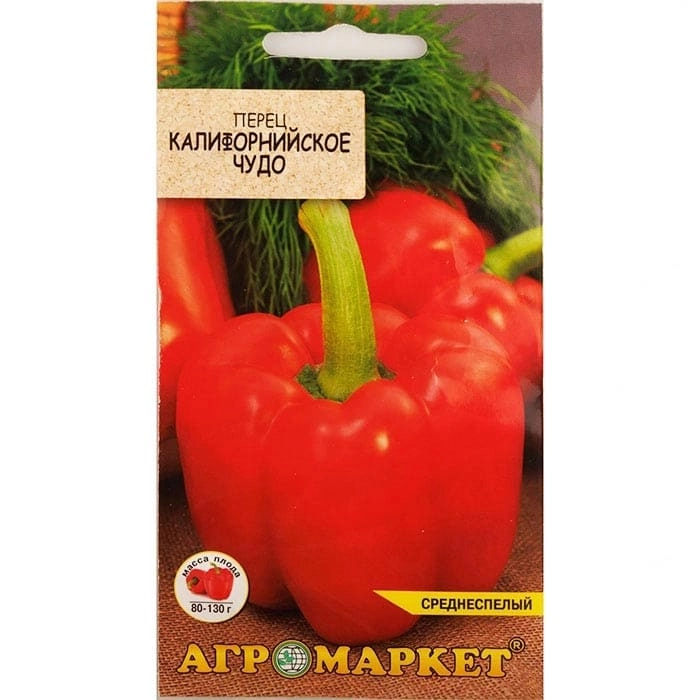 Перец Калифорнийское чудо (Польша) - сорт среднего срока созревания. От всходов до технической спелости 115-120 дней. Растение полудетерминантного типа, сильно облиственное, мощное, высотой до 80 см. Плоды кубовидные, красного цвета, толщина стенок 6-7 мм. Используются в свежем виде.