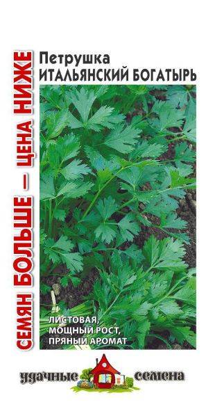 Петрушка листовая Итальянский богатырь 4г Удачные семена (Россия) - среднеспелый сорт, предназначенный для использования зеленых листьев. Посев в грунт производится в конце апреля – начале мая на глубину 1 см. Розетка листьев полувертикальная, высотой около 32 см. Черешок длинный, средней толщины со слабым антоцианом. Лист крупный, темно-зеленый, треугольной формы. Зелень хорошо отрастает после срезки, прекрасно подходит для выгонки зелени в зимне-весенний период, для получения раннего урожая на второй год после посева. Ароматичность высокая. Товарная урожайность около 3,0 кг/м2. Теневынослив. Ценность сорта: высокая урожайность, теневыносливость, высокие темпы нарастания зелени, высокая ароматичность. Рекомендуется для использования в свежем и сушеном виде.