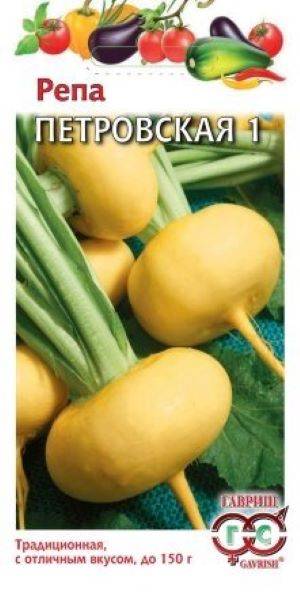 Репа Петровская 1 1г (Россия) - раннеспелый (65-75 дней от всходов до технической спелости) сорт. Корнеплоды плоские или плоскоокруглые, с вогнутым донцем, массой 60-150 г. Мякоть корнеплодов, золотисто-желтого цвета, твердая, сочная, сладкая, приятного вкуса. Рекомендуется для употребления в свежем, жареном, печеном, тушеном или фаршированном виде. Сорт урожайный, обладает высокими вкусовыми и диетическими качествами, хорошо хранится. Устойчив к киле. Урожайность 3,5-4,2 кг/м2. Посев проводят в конце апреля – начале мая или в конце июня— июле по схеме 10х20-25 см на глубину 1 см.