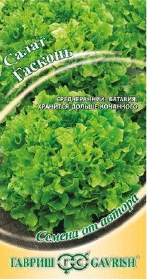 Салат Гасконь 0,5г листовой хрустящий Семена от автора (Россия) - среднеранний (начало хозяйственной годности наступает через 45-48 дней) сорт типа Батавия (новейший тип листового срезочного салата). Рекомендуется для выращивания в открытом грунте и под временными пленочными укрытиями. Розетка крупного размера, компактная, диаметром 30-35 см. Лист зеленовато-желтой окраски, волнистый, сильноизрезанный. Масса одного растения 450-550 г. По вкусу салаты типа батавия напоминают кочанные, но гораздо дольше сохраняют свою свежесть. Сорт устойчив к цветушности и основным заболеваниям салата. Посев семян непосредственно в грунт — в апреле — мае. На рассаду высевают — в марте — апреле, высадка рассады – в мае. Схема посадки: 25x30 см. Для формирования мощной розетки требуются регулярные и умеренные поливы, не допускающие как застоя воды, так и пересушивания почвы.