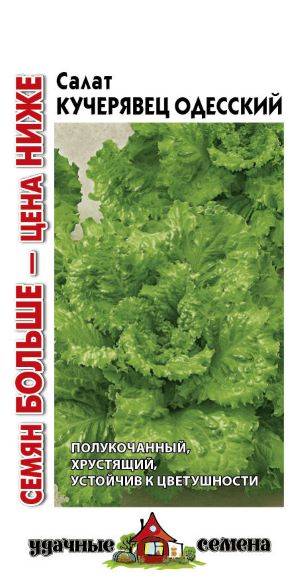 Салат Кучерявец Одесский 1г хрустящий Удачные семена (Россия) - среднеспелый (68–75 дней от всходов до уборки) сорт полукочанного типа. Розетка средней величины, рыхлая, диаметром 24–32 см, массой до 200 г. Лист веерообразный с гофрированным краем, хрустящей консистенции. Вкус отличный. Сорт устойчив к цветушности. Рекомендуется для выращивания в открытом грунте и пленочных укрытиях. Урожайность 2,7–5,0 кг/м2.