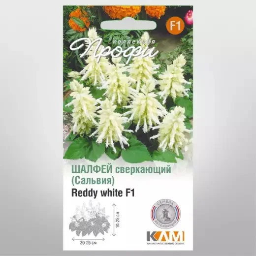 Шалфей блестящий Редди Уайт F1 (Италия) - единственный генетически карликовый, не вытягивающийся сорт шалфея на рынке. Растения Редди производят большое количество густо расположенных ярких цветков белого цвета над темно-зеленой листвой. Характерно раннее цветение и однородный внешний вид растений.