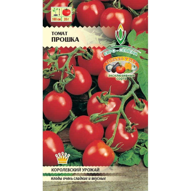 Томат Прошка 0,1г раннеспелый плоды черри красные (Россия) - раннеспелый сорт, период от всходов до массового созревания плодов 94-100 дней. Рекомендован для выращивания в открытом грунте и пленочных укрытиях. Растение индетерминантное, высотой 160-180 см. Плодоносят кистями, в кисти по 15-20 плодов вишневовидной формы. Плоды ярко-красные, блестящие, очень выравненные, массой 10-20 г. Плоды некрупные, не растрескиваются, пригодны для консервирования в малообъемной таре. Комплексная устойчивость к болезням, холодостойкость растений, позволят получить урожай томатов даже в неблагоприятное лето.