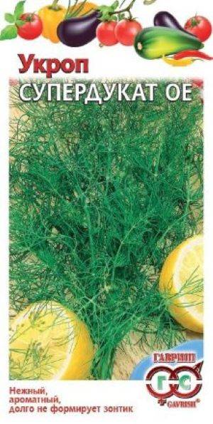 Укроп Супердукат ОЕ 3г серия Традиция (Россия) - среднеспелый (от всходов до уборки зелени 33-40 дней) урожайный сорт для выращивания на зелень. Розетка приподнятая. Листья зеленые, сильнорассеченные, нежные, сочные. Ароматичность сильная. Сорт характеризуется замедленным стеблеобразованием и заложением соцветий. Посев семян в грунт производится в конце апреля - начале мая. Урожайность зеленой массы 2,0-2,2 кг/м2.