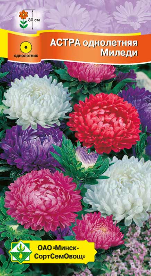 Астра Миледи см 0.15г - одна из лучших низкорослых групп. Смесь сортов. Куст компактный, с прочными побегами, высотой около 30 см. Одно растение дает 5-7 махровых пионовидных соцветий диаметром 8-10 см. Используется для выращивания на клумбах, балконах и в цветочных горшках. Семена на рассаду высевают с конца марта до середины апреля (с конца апреля возможен посев непосредственно в грунт). Рассаду высаживают в мае.