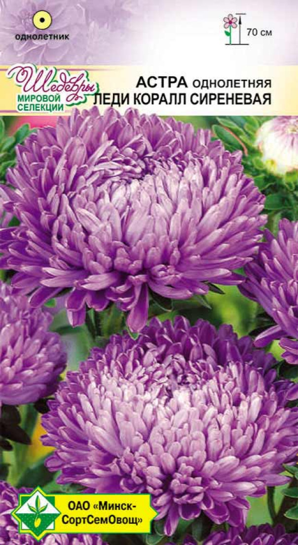 Астра Леди Коралл Сиреневая 0.1г (Беларусь) - новейший роскошный крупноцветковый сорт. Среднего срока цветения. Куст пирамидальный, прочный, высотой до 70 см. Цветет обильно и долго. Одно растение дает 8-12 стеблей для срезки. Завораживает красота густомахровых хризантемовидных соцветий сиреневого цвета диаметром 10-12 см. Твердые длинные стебли, изящные соцветия и превосходная их сохранность делают эти астры непревзойденными для срезки и клумб.