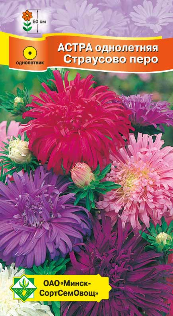 Астра Страусово перо см 0.3г (Германия) - декоративная обильноцветущая группа. Смесь сортов. Среднераннего срока цветения. Куст широкий, раскидистый, высотой около 60 см. Цветоносы слабооблиственные, до 40 см длиной. Соцветия махровые, плоско-округлые, в диаметре 10-12 см. На кусте до 20 цветущих соцветий. Используется для клумб и срезки. Посев на рассаду производят с конца марта до середины апреля. В открытый грунт рассаду высаживают в мае на солнечное место.