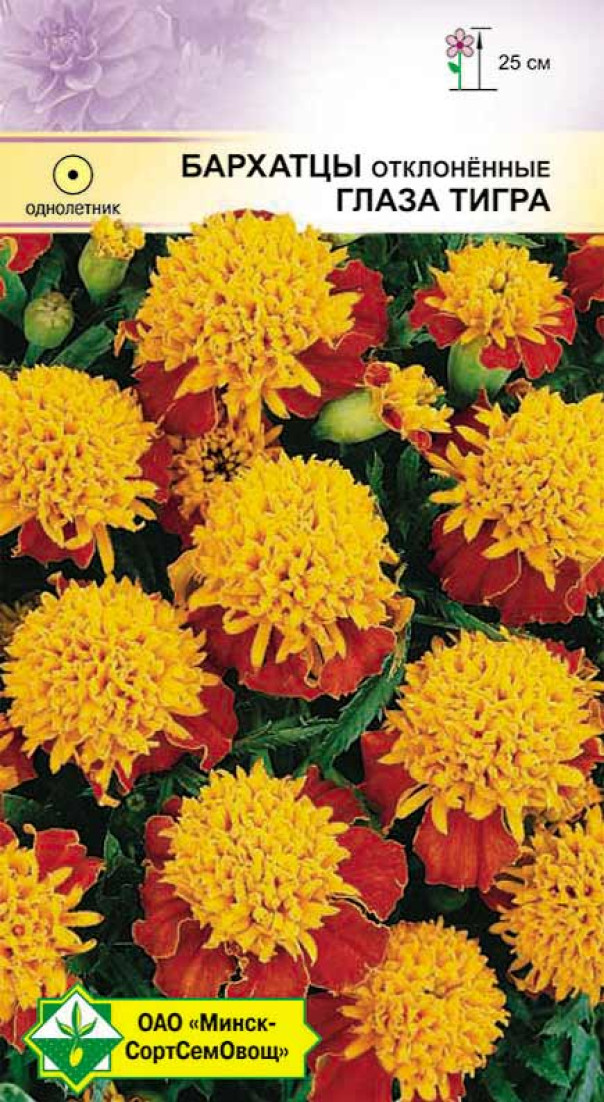 Бархатцы отклоненные Глаза тигра 0.5г МинскСортСемОвощ. Однолетнее растение высотой до 25 см. Компактный куст покрыт эффектными бархатными цветками. Оригинальные красно-коричневые с ярко-оранжевой серединкой соцветия в диаметре 5-6 см, махровые. Прекрасны для оформления клумб, бордюров, балконов. Семена высевают на рассаду в конце марта-апреле или прямо в открытый грунт в мае. Рассаду высаживают в грунт на солнечном месте или в полутени в мае, когда минует угроза заморозков.